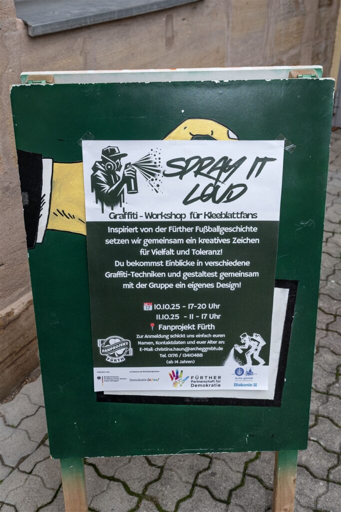 Der Workshop wurde am 10. und 11.10.2025 im Fanprojekt Fürth durchgeführt und in enger Kooperation mit Style Scouts Nürnberg, einem professionellen und pädagogisch erfahrenen Graffiti-Team, umgesetzt. Durch diese Zusammenarbeit entstand ein geschützter Lernraum, in dem sowohl künstlerische Fähigkeiten als auch gesellschaftliche Kompetenzen gefördert wurden.