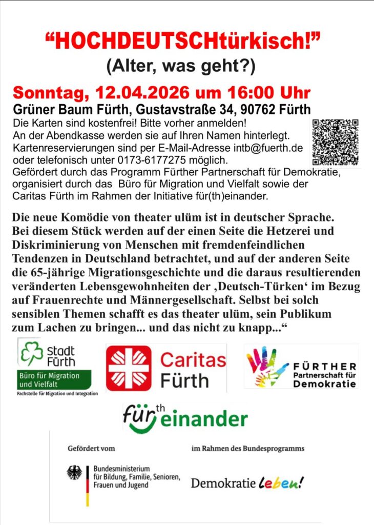Gefördert durch das Programm „Demokratie leben“ präsentieren die Initiative Leben, das Büro für Migration und Vielfalt sowie die Caritas Fürth im Rahmen der Initiative „Fürtheinander“ das Theaterstück.
